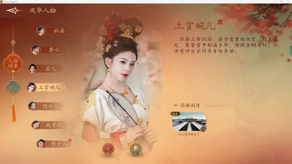4,本作的人物档案其实也是没太大用处的类型,因为所说的一切基本已在正片里展示了,就是没有什么线索的,以上三点老实说其实可以归纳到趣点也没有问题,现在唯一一个稍微有点价值的个人档案,上官婉儿,作为续作才会出现的角色,她的个人档案里的视频是续作的一点点透露,正片里并没有出现。