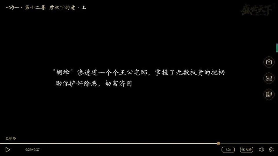 前言:这又是一部我期待已久的作品,期待了很久了真的,个人是比较喜欢“剧情流”作品的,认真叙事那种,像这种历史题材,或者战争,间谍,警匪,悬疑,科幻,猎奇,抽象等等我都很喜欢,要不是实在无聊或者空挡时间太长要找题材,或者真的久负盛名的佳作的话,我是一般不会想去玩恋游的,因为大多都是剧情单调,而且可以“一眼到底”,几乎不用开始都知道结局那种。 本作也是坊间听闻是目前暂时为止投资最高的国产影游,成本5000多万+的影游圈的天花板级预算,老实说是否真的是投资最高这个我不知道,也没有相关证据去核实,但投资很高这个是完全可以用肉眼可见来形容,但凡对“成本”这种东西有点阅历,看10几分钟就能判断出质感,本作是不是“最”不清楚,但一定是很高成本,制作精良的大体量,大规模的大作。 按照惯例,先说一下我的评价,4分,作品实际分数是3分,剧情不算科幻,不算降智,是正正常常不过不失,非短剧和过往影游的剧情,算是电视剧那种相对真实系的剧情,但这个其实得益于本身有真实历史作为大框架,也有原著改编的加持的双重加持再改编的,可以说其实制作组能做的创作并不多,本身有历史作为主骨骼,原著就已经空间不多了,制作组再在原著上再改编,哪怕是请了前作(《隐形守护者》)的原著“赤途”的作者范特西来做顾问,其实也只能从一些关卡设计,游戏玩法,或者一些诡计上去做细节优化,并不能变出太大水花来了,多一分是给大制作,的确是超级豪华的制作,当然以后会有更豪华的,不过这次是第一次,然后演员非常多,真的非常多角色,所以4分。