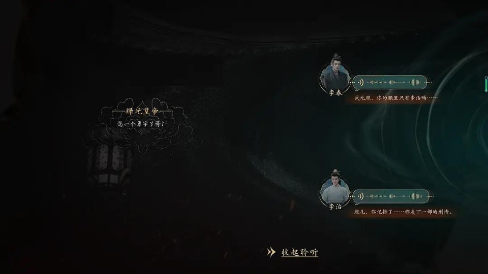 5,有一首BGM跟“明末”里打夜夫人时的那首BGM很像……是一首旋律很诡异的音乐,但挺喜欢的我,《明末:渊虚之羽》那首叫《孽爱》,不知道《盛世天下》里用的是不是同一首音乐,除了剧情以外,有时候在故事线里停留的BGM也能听到,不知道大家有没有发现呢?就是那个变奏很像。
