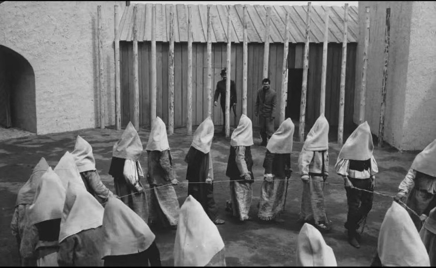 该片的匈牙利原版片名直译应为 “绝望者”(The Hopeless Ones)。这一名称既指代影片中的核心群体 —— 被关押在广袤的匈牙利草原(译注:位于匈牙利东部豪伊杜-比豪尔州,是欧洲最大的自然草原。1999年因其延续2000多年的游牧文化景观,被联合国教科文组织列为世界文化遗产。现在当地成立了自然保护区“霍尔托巴吉国家公园”)中央一座名为 “土方工程”(Earthworks)的诡异乡村拘留营(或集中营)里、身份不明的囚犯们;也暗含了一层更宽泛的隐喻:无论处于何种政治局势或时代背景下,被无形的权力枷锁束缚的民众群体。银幕上的这些男男女女,正长期承受着二十年前民族主义与革命浪潮退去后,复兴政权因偏执而施加的压迫。在影片中,匈牙利军队当时正听命于奥地利(不久后便归属新生的奥匈帝国),他们的行动似乎被一个名叫山多尔・罗扎(Sándor Rózsa)的人物所牵制。罗扎是真实历史人物,集革命志士、民族主义游击战士与 “贝提亚尔”(betyár,译注:即东欧文化语境中常见的 “绿林好汉”)身份于一身,类似形象在其他国家的文化叙事中也颇为常见。(译注:山多尔・罗萨(1818–1878)是 19 世纪匈牙利极具传奇色彩的民间人物,常被后世称为 “匈牙利的罗宾汉”,其生平与传说深刻交织,成为匈牙利民族记忆、文学艺术及电影创作中的重要符号。)但在本片中,罗扎从未正式登场,始终保持着一种半神话般的模糊存在。然而,他究竟是真实存在还是虚构象征、是生是死、是在场还是缺席,最终都变得不再重要 —— 因为这个民间符号本身,就代表着持续反抗的理念与精神。影片中有这样一个情节:一名囚犯告诉父亲自己从未见过罗扎,却被父亲纠正:“你见过他很多次了。” 与此同时,尽管士兵们似乎明知这位传说中的反抗领袖并不在营中,却仍不断盘问囚犯,追问罗扎是否藏在营里。正如影片结尾那幕令人不寒而栗却符合政治逻辑的场景所深刻揭示的,政权真正的敌人,与其说是罗扎本人,不如说是他的追随者们,以及他所代表的反抗思想—— 甚至可以说,是民众本身。