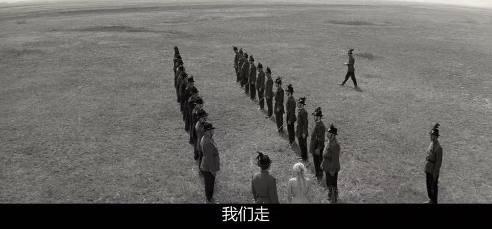 导演对叙事弱化的独特处理方式,以及对人物与心理的极致淡化,也在此处得以切实确立。影片前期场景中,曾有一位农民看似有望成为主角:他试图通过向军官告密、揭发其他囚犯来换取自身惩罚的减轻,这番交涉却以徒劳告终。但个体能动性与叙事推进这两大核心驱动力,很快便归于无效。此外,《静默与呼喊》与《红色赞美诗》中所呈现的 “群体主角” 意识 —— 这种设定隐约契合共产主义理念,也借‘群体主角’承载着 “真实” 的革命行动 —— 在本片中似乎从无成立的可能。无论是个体还是群体,都远未拥有足够的自由去推动任何有意义的改变。唯有遥远的帝国政权,才具备这样的能力。