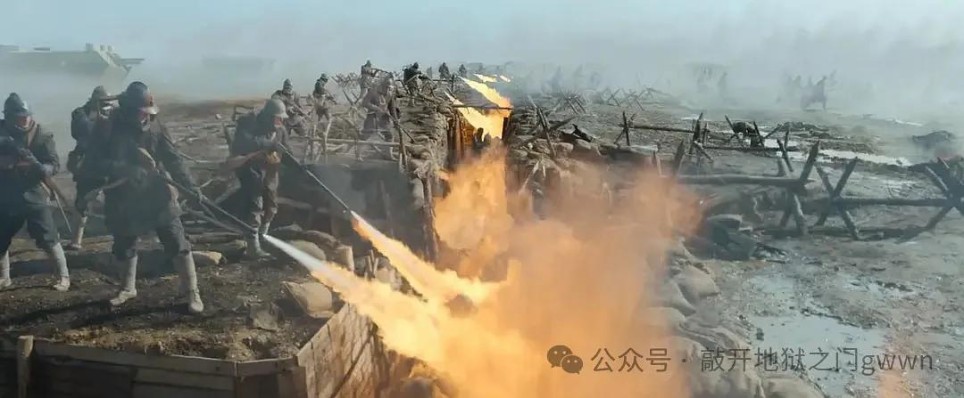 上图:整部电影中最令人智熄的场景之一:法国喷火兵站成一排烧自家战壕。